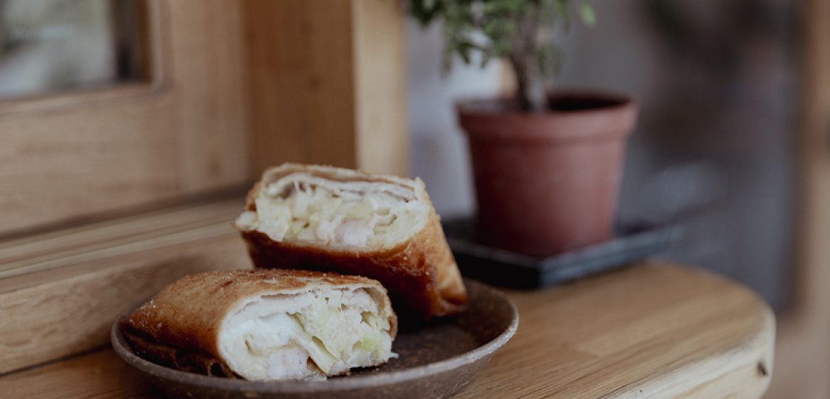 回到潤餅店後,他想創造出屬於自己的產品。「家裡賣的是傳統潤餅,備料很繁瑣,我想做出一種可以一人作業、又能保留風味的潤餅形式。」於是他將餅皮技藝轉化成「煎炸春捲」,加入蛋、菜與肉,強調現點現做、保留酥脆與香氣。